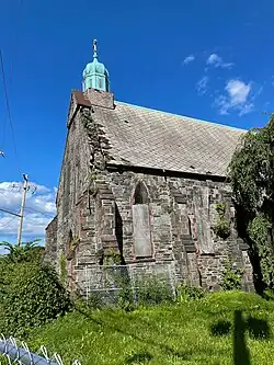 Underneath that vegetation on the west (front) facade are heavy corner buttresses, an arched central entrance, four lancet windows on the second story and a single triangular window in the gable. The nave is five bays long, with an additional entrance at the northeast. A smaller projecting gable on the east with two small shed-roofed wings is the chancel.[2]