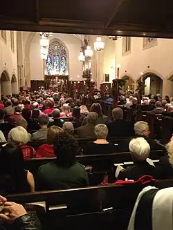For choral evensong, which is held each Sunday from September through May, the choir takes after the English cathedral and collegiate tradition in following the rite set forth in the 1662 Book of Common Prayer. The choirs use one setting of the Preces and Responses throughout the month, many settings of the Magnificat and Nunc Dimittis are used in rotation, and the remaining music is determined by the propers for the day. In December 2012 the ensemble was heard in a nationwide broadcast of their annual Service of Lessons & Carols; the broadcast was carried by Public Radio International.