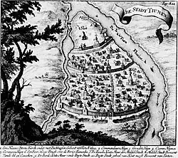 An image of Tyumen between the 1668 and 1695 fires. Print from Nicolaas Witsen's book Northern and Eastern Tartaria.