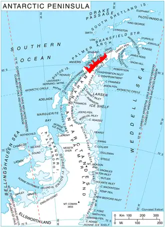 The Important Bird Area (IBA) lies 50 km to the east of Brabant Island, with Cierva Point forming both the northwest extremity of Sladun Peninsula and the south side of the entrance to Cierva Cove. The IBA is defined by the same boundary as Antarctic Specially Protected Area (ASPA 134) which includes Cierva Point, Midas Island, Sterneck Island, Moss Islands and other offshore islands as well as the intervening sea and intertidal zone. At Cierva Point the south-facing slopes are glaciated, whilst the north- and west-facing slopes are ice-free. The land rises to over 500 m at the coastal cliffs. The Argentine Primavera Station lies close to the IBA boundary on the northern tip of Cierva Point.[1]