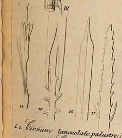 4. ^ a b Reichenbach, Heinrich Gustav (1853). "Cirsium". Deutschlands Flora, mit höchst naturgetreuen, charakteristischen Abbildungen aller ihrer Pflanzenarten in natürlicher Größe und mit Analysen auf Kupfertafeln, als Beleg für die Flora Germanica Excursoria und zur Aufnahme und Verbreitung der neuesten Entdeckungen innerhalb Deutschlands und der angrenzenden Länder: Belgien und Holland, Dänemark, Preussen, Galizien, Polen, Siebenbürgen, Ungarn, Kroatien, Dalmatien, Istrien, Venedig, der Lombardei, Piemont, der Schweiz, dem Elsaß. Vol. 15. pp. 67–101.