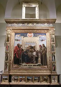 The displays occupy five halls in the first floor, and include works from diverse centuries. Among the Renaissance works is the large altarpiece, called the Pesaro Altarpiece or Pala di Pesaro, depicting the Coronation of the Virgin (1475) by Giovanni Bellini. It was originally located in the church of San Francesco, Pesaro.