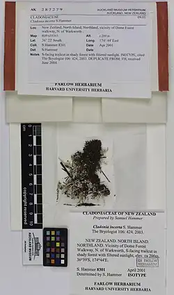 Cladonia incerta is a species of fruticose lichen in the family Cladoniaceae.[2] Found in New Zealand, it was formally described as a new species in 2003 by the lichenologist Samuel Hammer. He collected the type specimen near the Dome Forest walkway north of Warkworth. The species epithet incertain refers to the uncertain ontogeny (development) of the podetia, which take various forms.[1]