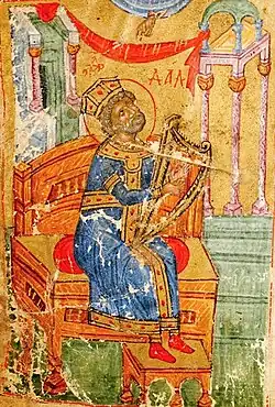 Another Georgian chronicle, the anonymous Life of King of Kings David, written c. 1123–1126, declares its subject, King David IV of Georgia (r. 1189–1125), to have been the 78th descendant of his biblical eponym. Later on, the chronicle compares David IV's coronation of his son Demetrius I, prior to the former's death, to the biblical David's enthronement of Solomon and once again emphasizes the "resemblance to his ancestral stock". A contemporaneous versified dedicatory inscription on the venerated icon of the Mother of God, known as the Khakhuli triptych, which mentions David IV and Demetrius I, compares the Virgin Mary's Davidic descent to that of the Georgian Bagratid monarchs.[33] The legendary biblical lineage was also reflected in the later dynastic surname Jessian-Davidian-Solomonian-Bagrationi, not infrequently encountered in the Bagratid documents.[34] The symbols associated with David, a harp and sling, appear in the Bagrationi heraldry, the earliest known example dating from the late 16th century.[35]