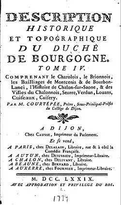 Courtépée had great interest in the history of the province of Burgundy, to which he devoted all his available time, including researches in libraries and travels around the province.[2] His Description générale et particulière du duché de Bourgogne précédée de l'abrégé historique de cette province (Dijon, 1774–85) was a highly esteemed work that was reprinted in 1846–48. Courtépée wrote an abridged version of this work.[4] His writings are generally reliable and are still used as a source. The first volume of his Description générale et particulière appeared in 1774, and the next five appeared in the six years that followed. He also undertook correction of the portable geographical dictionary, Le Vosgien, and provided some notes to the Encyclopédie.[1]