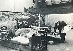 At Giverny the family worked and built up the gardens, and Monet's fortunes began to change for the better as Durand-Ruel had increasing success in selling his paintings.[101] The gardens were Monet's greatest source of inspiration for 40 years.[102][103] In 1890, Monet purchased the house.[65] During the 1890s, Monet built a greenhouse and a second studio, a spacious building well lit with skylights.