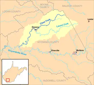 The Clear Fork is a tributary of the Guyandotte River, 29 miles (47 km) long,[3] in southern West Virginia in the United States. Via the Guyandotte and Ohio rivers, it is part of the watershed of the Mississippi River, draining an area of 129 square miles (330 km2)[4] in a rural area on the unglaciated portion of the Allegheny Plateau. The Clear Fork flows for its entire length in Wyoming County; its tributary the Laurel Fork also drains a small area of western Raleigh County.[5]