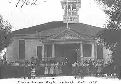 From the book Images of an Age:[2] "Community members tried unsuccessfully to form a high school district as early as 1889. At the time, families sent their sons to Santa Clara or Stockton to schools beyond eighth grade. Daughters went to San Jose, if they went at all. Then, on June 6, 1899, Lee Beal, a Jefferson Colony Farmer, and John Rutledge, a Clovis millman, led seven school districts to join in formation of one high school district. Each of the seven elected one trustee to the board. The school was named Clovis High School, although it was the union of Red Banks, Jefferson Colony, Garfield Colony, Mississippi Settlement, Wolters Colony, Temperance Colony, and Clovis. Seventeen high school students enrolled in classes at the Clovis school. Louis K. Webb, principal and teacher, received $120 per month. Estelle Kellogg joined the staff in September. Two students, Emory Reyburn and R.E.L. Browne, graduated in the first class of 1902. A separate Clovis High School was financed by bonds in 1903, east of the railroad track between Fourth and Fifth Streets. It was replaced in 1918."
