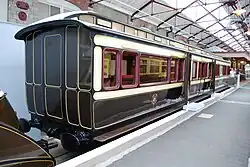 The livery of early carriages was a dark chocolate brown but from 1864 the upper panels were painted white which became a pale cream after being varnished and exposed to the weather. These panels were later painted in cream to give a similar effect. From 1908 carriages were painted chocolate brown all over but this changed to a red lake colour in 1912. A two-colour livery reappeared in 1922, now with a richer shade of cream on the upper panels and chocolate brown below. Certain vehicles such as parcels vans and horse boxes, which were allowed to run in passenger trains, were often painted in just chocolate brown when the passenger carrying coaches were in chocolate and cream, and so this non-passenger carrying coaching stock came to be known as "brown vehicles".[3]