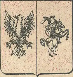 The design of the coat of arms of Podlaskie Voivodeship of the Crown of the Kingdom of Poland, that existed from 1513 to 1795, consisted of a red escutcheon divided into two vertical halves. The left half depicted a white eagle with yellow (golden) legs, with risen wings. The right half depicted a knight in a white (silver) armor, sitting on a white (silver) horse with a blue saddle and shabrack, standing on its back hoofs. The knight has a blue shield with a yellow (golden) cross of Lorraine on it, put on his left arm, and hold a sword in his right hand. The coat of arms symbolized the control of the Polish–Lithuanian Commonwealth over the region, with the eagle being symbol of the Crown of the Kingdom of Poland and knight on the horse, the Grand Duchy of Lithuania.[2]