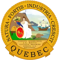 The former seal is a goddess sitting on the foot of Cap Diamant holding a abundance corn and a shield having a red British lion. Next to her is a bee hive and a beaver. In front of her is a ship sailing on the St. Lawrence River. Far away is the silhouette of the Laurentides. The motto is ­­″Natura Fortis Industria Crescit″ (It owes its power to nature and its growth to work). At the bottom of it all is written, still in latin, ″Condita Quebeccense A.D. MDCVIII - Civitatis Regimine Donata A.D. MDCCCXXXIII″. The heraldists who designed the coat of arms which are used today thought that this much detail may be hard to comprehend. [7] To make the redesign, a committee for coat of arms was created in 1946. [8]