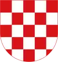 The Coat of arms of the Croatian Republic of Herzeg-Bosnia is the variation of the historical Croatian coat of arms (chequy of 25 red and white squares) in the form of a stylized Polish heraldic shield with triple wattle on top. It is bordered by golden lines.