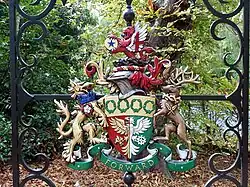 The circlet or enclosure of brushwood from which the lion is rising on the crest is from the arms of Hayes and Harlington, and may refer back to its ancient heritage as forested hunting land. The same can be said of the stag with a circlet of brushwood supporting the shield on the right. The lion itself represents Great Britain. Its wings, with the St George cross, are from the arms of Yiewsley and West Drayton and symbolise the arrival of Queen Elizabeth II at Heathrow airport in 1953. The blue 'astral' crown on the tiger supporting the shield is in the colours of the Royal Air Force, and celebrates its long history within the Borough. The Tudor rose on the same tiger is from the arms of Yiewsley and West Drayton and is a historic English royal badge.[2]