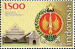 The coat of arms of the Special Region of Yogyakarta or often called golong-gilig is a round (golong) and cylindrical (gilig) emblem consisting of a painting of stars, rice and cotton, a winged monument, a red circle surrounded by the words in Javanese "Rasa suka ngèsthi praja Yogyakarta trus mandhiri" using Javanese script and surrounded by a white circle, and a lotus-topped ompak.
