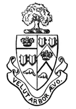 The motto, which is not itself part of the arms but of the overall heraldic achievement, is velut arbor aevo, Latin for "may it grow as a tree through the ages".[3] This phrase originates from Horace's Odes, book I, ode 12, line 45: crescit occulto velut arbor ævo fama Marcelli ("the fame of Marcellus grows like a tree over time unseen").