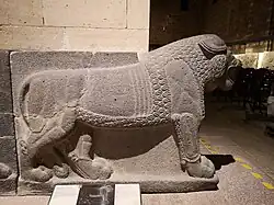 It was visited by Mary Scott Stevenson in 1881 who noted that there were three basalt orthostats depicting a lion hunt on the wall of a private home there.[3] The site visited by Karl Humann and Felix von Luschan in 1890 where they made some sketches and also removed the three orthostats to take to the Pergamon Museum in Berlin.[4] John Garstang was the first excavator in 1908 and 1911. In addition to excavating the periphery wall of a late Hittite palace, finding reliefs, several trenches were dug finding black incised and burnished ware at the bedrock level.[5][6][7][8] He was interested in the Hittite material on the surface of the site and discovered the portico of a bit hilani Hittite palace, now in Ankara, as well as the earliest excavated Halaf period material culture. Hittite era sculptured reliefs were found, recorded and then buried for safety at the end of excavations.