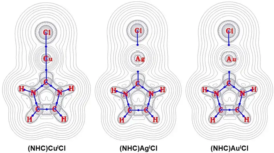 A Natural Bond Orbital analysis provides calculated charge distributions, which indicate increased NHC carbene p(π) orbital population relative to the free NHC; this can be attributed to increased NHC aromaticity when coordinated to a metal center.[13] Topological analysis of the electron density also shows that all three M-NHC bonds have meaningful ionic character in addition to some covalent character.[13] The Ag-NHC bond shows the most ionic character, while the Au-NHC bond shows the most covalent character.[13] For a series of M(NHC)(halide) and M(NHC)2 complexes studied by Nemcsok et al., Energy Decomposition Analysis assigns 68-78% of the attractive interactions to classical electrostatic attraction.[18] Again, the Ag complexes have the lowest calculated M-NHC bond dissociation energies with the highest calculated M-NHC ionic character percentages, while the Au complexes have the highest calculated M-NHC bond dissociation energies with the lowest calculated M-NHC ionic character percentages; the Cu values are intermediate.[18] (Note that electrostatic contributions are just one part of the overall bond dissociation energy calculations; while the Ag-NHC bonds have the greatest percentage of electrostatic contributions into the overall bond dissociation energies, the Au-NHC bonds have the greatest bond dissociation energies in magnitude).[18] Of the remaining covalent character, the majority is calculated to emerge from σ donation; the Cu complexes have the highest calculated percentages of π back-donation contribution.[18] These trends generally match the observations for coinage metal bond strengths where Au > Cu > Ag bonds.[19] Experimental bond length analyses corroborate the computational results, especially with regard to the relative levels of NHC aromaticity and the relative levels of back-donation.[13][16]