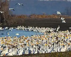 The arrival of thousands of American white pelicans from November to March at the fishing village of Petatán has become a tourist attraction. The pelicans are dubbed borregones by the locals, in reference to the sheep-like flocks created by these large white birds. A mass feeding of fish scraps from the local filleting operations occurs in the afternoon of every day except Sundays.[11]