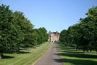 The house is approached down an avenue of trees and by crossing two small lakes in the valley bottom, which drain to the River Lark. From time out of mind there has been a footpath alongside the grounds of the Hall, giving parishioners past and present a view of the mansion.[2]