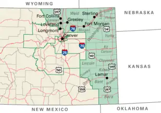 Following the 2010 U.S. census and associated realignment of Colorado congressional districts, the 4th congressional district consisted of Baca, Bent, Cheyenne, Crowley, Elbert, Kiowa, Kit Carson, Las Animas, Lincoln, Logan, Morgan, Otero, Phillips, Prowers, Sedgwick, Washington, Weld and Yuma counties. The district also includes portions of Adams, Arapahoe, Boulder and Douglas counties and very little portions of Larimer County .
