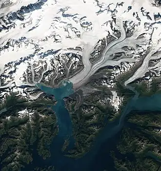 The Columbia Glacier, a glacier in Prince William Sound on the south coast of the U.S. state of Alaska, is one of the fastest moving glaciers in the world, and has been retreating since the early 1980s. It was named after Columbia University, one of several glaciers in the area named for elite U.S. colleges by the Harriman Alaska Expedition in 1899.[1] The head of the main branch of the glacier originates at the saddle between Mount Witherspoon and Mount Einstein.