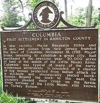 Columbia Township is named after the Columbia settlement, which Benjamin Stiles founded in 1788 as part of the United States' expansion into the Old Northwest Territory. This settlement represents one of the earliest recorded white settlements in the ancestral territory of the Native American, Shawnee people. Columbia is located in the historical Miami Valley, near Cincinnati Municipal Lunken Airport and now part of Cincinnati's Columbia-Tusculum neighborhood.[1][2] Statewide, other Columbia Townships are located in Lorain and Meigs counties.