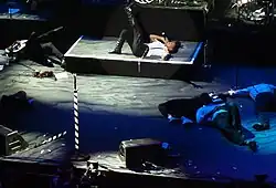 "Come Alive (The War of the Roses)" has been performed as a final song or during the encore Monáe's ArchAndroid Tour (2010),[7] Hooligans in Wondaland Tour (2011)[8] and The Electric Lady Tour (2013),[9] as well as multiple festival performances such as Glastonbury Festival 2011.[10] Monáe performs the song as a 10-minute extended version,[11] incorporating call and response.[12] During the performances, Monáe and her band members lie down on the stage, and Monáe asks the audience to lie down as well. The band and Monáe continue to sing the song while they are on lying on the stage.[7][10] Critics such as Dan Meade of The Manic American have praised Monáe's "commanding" stage presence during performances of "Come Alive",[11] while others have praised how high energy Monáe's performance is.[8] In 2020, Monáe performed a version of the song to open the 92nd Academy Awards ceremony, with the lyrics modified to reference the event.[13]