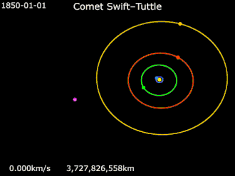 Animation of 109P/Swift–Tuttle orbit from 1850 to 2150 (  Sun ·   Earth ·   Jupiter ·   Saturn ·   Uranus ·   109P/Swift–Tuttle)