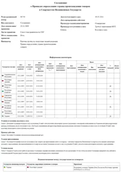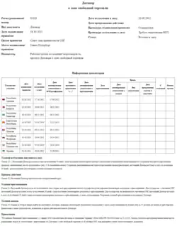 The treaty is de jure open for accession even for those countries that are not participants of the CIS (Article 24).[10] For each country, upon entry into force, the rules of origin adopted on 20 November 2009 will apply to mutual trade (Article 4), while the 1994 free trade agreement and the 1999 protocol will cease to be in effect among ratifiers (Annex 5).[11] In accordance with the rules of origin, the goods must be provided with a preferential certificate CT-1 or a declaration of origin (if no irregularity is suspected) in order to be admitted to markets without tariffs.[12][13]