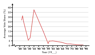 Year Number of Candidates Total votes Average voters per candidate Percentage of vote Saved deposits[1] Change (percentage points) Number of MPs[2]