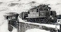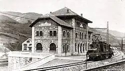 On July 24, 1918, the Minister of Public Works Francesc Cambó approved the electrification of the Pajares ramp, the objective of which was not to electrify the entire line, but only the 62-kilometer section between Uxo and Busdongo.[2] After studying the various proposals submitted by the main North American and European companies, the one presented by the General Electric Company was finally selected. The voltage of the catenary would be 3,000 volts, in direct current. This system was until then used exclusively in the United States and in fact its first important application was for the Chicago, Milwaukee, St. Paul and Pacific Railroad (CMStP&P), between 1915 and 1917. Although this system presented a much higher voltage than that which had been used in Europe until then, it offered the advantage of requiring fewer substations and a cheaper catenary. The contract with General Electric was signed in 1921, and commissioning took place on January 1, 1925.[2]