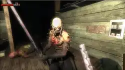 Blocking is an essential component of the game mechanics as the player can only take a few melee hits before dying. A successful block momentarily knocks an enemy off balance, giving the player a chance to attack.[10][19] An additional component of the game's melee is the ability to perform "finishing moves" when an opponent is on their knees, such as a headbutt, a neck break, a punch, or a head slam.[12][20] The player can also use a quick-kick, which is available at all times; if the player is unarmed, if they are carrying a firearm, or if they are carrying a melee weapon.[10]