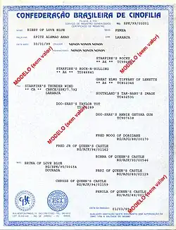 A pedigree issued by the Confederação Brasileira de Cinofilia.