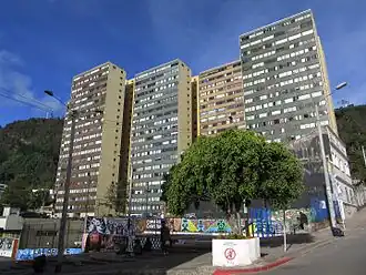 The Torres Gonzalo Jiménez de Quesada were constructed as part of the urbanization project in the late 1960s and 1970s.[2] They are locates in the centre of Bogotá; the locality La Candelaria. The complex of the five residential towers, each 72 metres (236 ft) in height, consists of 390 apartments, next to the Universidad de los Andes.[3] The towers are the highest buildings in the historical centre of the Colombian capital.[4]