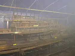 Waterlogged wood is a wooden object that has been submerged or partially submerged in water and has affected the original intended purpose or look of the object. Waterlogged wood objects can also include wood found within moist soil from archaeological sites, underwater archaeology, maritime debris, or damaged wood objects. Conservation of waterlogged wood has changed throughout time. Due to the delicate structure of this organic material, conservators and museum professionals alike have struggled with finding a textbook method. An example of the conservation of wood and how it has changed over time can be illustrated by the conservation treatments of a Kefermarkt altar. The earliest attempt at wood conservation is recorded as late as 1852–1855, A. Stifter treated the Kefermarkt altar in Austria with table salt in an attempt to protect the wood against pests. In around 1916-1918 Councillor Bolle attempted to protect the wood altar from pests included brushing the wood with petroleum and hexachloroethane. Finally, in 1929 the use of hydrogen cyanide relieved the pest problem and preserve the woods longevity.[1] From a conservation standpoint, waterlogged or not, wood has been difficult to preserve because it is an organic material.