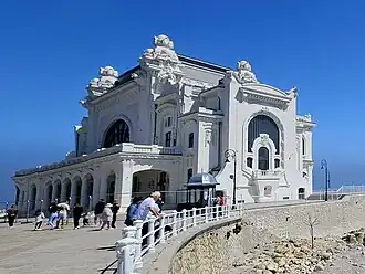 Three different buildings were constructed in the district to house a casino, with the first structure being erected of wood in 1880. Considered a symbol of the city of Constanța, the current structure was built in Art Nouveau style, designed and built according to the plans of Daniel Renard and inaugurated in August 1910.[2] The current Casino was used for gambling operations for 38 years, with interruptions due to the two world wars: attacked and bombed by Bulgarian and German troops in World War I, ravaged in World War II, and, at one point, acting as a makeshift wartime hospital. In 1948, it was transformed into a community centre, and in 1960, it was handed to the National Office of Tourism, which converted it into a restaurant. The last major repairs took place in 1986–1988, and the building was abandoned until 2019.[3] After five years of renovation works, the casino was again opened to visitors on 21 May 2025.[4][5]