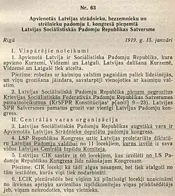The Constitution of the Latvian Socialist Soviet Republic (Latvian: Latvijas Sociālistiskās Padomju Republikas Satversme) was adopted by the 1st Congress of the Executive Committee of the Soviet of Workers, Soldiers, and the Landless in Latvia (Iskolat) on January 15, 1919. The constitution was the first constitution of the modern Latvia, prior to the adoption of the Constitution of Latvia on 7 November 1922.