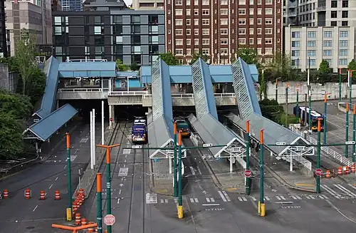 The station was closed on July 21, 2018, and was replaced by a set of new stops on 9th Avenue serving the tunnel's remaining buses. A $4 million bus ramp was constructed to connect 9th Avenue to the transit tunnel while the rest of the station was being demolished.[57][58] After the station site was fully cleared and construction of the convention center expansion began, the temporary ramp was demolished.[59] A traction power substation for surface trolleybuses was removed in 2018, prior to construction of the convention center expansion.[60][61] The remaining buses using the transit tunnel were moved to surface streets and truncated at light rail stations on March 23, 2019.[57][59]