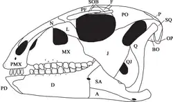 Additionally, a unique combination of traits is present that in themselves are not unique. Some of these traits are basal or symplesiomorphies. The premaxilla bears teeth. The entire upper rim of the eye socket is covered by two supraorbitals.[1] Other traits are derived characters, indicating a position higher in the evolutionary tree. The roots of the maxillary teeth are curved. The neck vertebrae are opisthocoelous, convex at the front and concave at the rear. With the sacral vertebrae the neural spines have twice the height of the vertebral body. The rear end of the ischium is expanded into a "foot". Between the fronts of the condyles of the thighbone only a shallow groove is present. The prepubic process of the pubic bone is transversely flattened.[1]