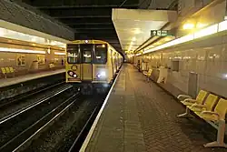 During the daytime peak (7:00 - 19:00), there are four trains per hour to New Brighton and West Kirby and eight trains per hour to Liverpool. Outside of the daytime peak, the frequency is halved.[10] These services are provided by Merseyrail's fleet of Class 777 EMUs.