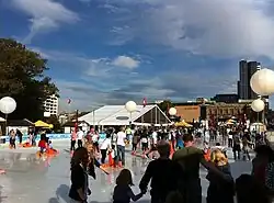 The City of Sydney appointed co-designers in Bligh Voller Nield and landscape architect Spackman Mossop with construction commencing in November 1997.[1] The development involved the removal of the bowling club and Boomerang Street and Haig Avenue. The Centre was officially opened by Lord Mayor Frank Sartor in August 1999 after months of delays and nearly $10 million over-budget.[4]
