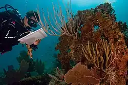 Coral diseases are transmissible pathogens that cause the degradation of coral colonies. Coral cover in reef ecosystems has decreased significantly for a diverse set of reasons, ranging from variable environmental conditions to mechanical breakdowns from storms.[1][2] In recent years, diseases that infect and kill coral have shown to be a threat to the health of coral reefs. Since the first coral disease was reported in 1965, many different kinds of diseases have popped up in mostly Caribbean waters.[3] These diseases are diverse, including pathogens of bacteria, fungi, viruses, and protozoans.[1] Coral diseases have widespread implications, impacting entire ecosystems and communities of organisms. Researchers are working to understand these diseases, and how potential treatments could stop these pathogens from causing the widespread death of corals in a way that permanently impacts the community structure of reefs.[4][5]