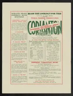 That same year, a Utah-based playwright named Orestes Utah Bean combined Roberts' story with Julia A. McDonald's 1896 novella A Ship of Hagoth to create a stage play titled Corianton: An Aztec Romance. He did not attribute his liberal borrowings from both works.[6] With the financial backing of George Elias Blair, Bean presented the play in Salt Lake City with Joseph Hawthorn in the title role and Rose Agnes Lane in a major female part in 1902. It was criticized by critics as too long, but was a theatrical success. It failed when it went on the road to non-Mormon audiences but was then successfully revived in Salt Lake City and other smaller Utah communities.[7] A 1902 article from The Brooklyn Daily Eagle wrote that Bean's motivation in writing the play was to spread "the doctrine of Mormonism".[8] Writing in his 2018 book Mormon Cinema: Origins to 1952, Randy Astle described the dialogue of the play as veering "between the contemporary and a poor pseudo-Elizabethan affectation," showing Bean's vision of Corianton as an epic.[9]