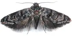 ♀ 8 mm. Head whitish, crown sprinkled grey. Palpi whitish. Thorax brownish sprinkled dark grey. Forewings suboblong, apex obtuse, termen slightly rounded, oblique; brown; a transverse streak of blackish irroration near base, beyond this a fascia of dark grey and whitish irroration, including two successive white spots in disc; plical and first discal stigmata represented by two spots transversely placed of raised blackish scales suffused coppery and tipped prismatic-metallic, above these a blackish spot on costa followed by slight whitish irroration; irregular narrow angulated fasciae of dark grey and whitish irroration crossing wing beyond middle and at 4/5, connected on costa, between these a curved transverse streak of raised blackish scales in disc, immediately beyond second a white spot on costa; a marginal streak of dark grey and whitish irroration round posterior part of costa and termen, preceded by an irregular blackish streak; cilia fuscous with strong, coppery-metallic reflections, a blackish subbasal line. Hindwings dark grey; cilia grey, a dark fuscous subbasal line.