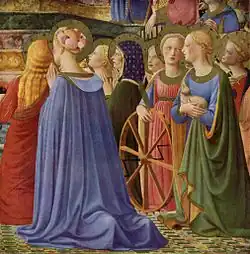 Such as in the Florence painting, the angels and the saints form the audience at the side of the central scene, but the figures are more defined and some are shown from back, and the pavement's tiles are painted according to geometrical perspective. Pope-Hennessy supposed that the angels were influenced by those in the San Brizio Chapel of Orvieto Cathedral (1447).
