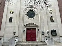 These buildings were replaced in 1930 with a new church and rectory built 1930 to the designs by Thomas Dunn and Frederick E. Gibson.[2] The current church, school, and convent were dedicated on October 25, 1936.[3] The church was designed in 1935 by Wilfred E. Anthony.[2] The current baptistery survives from F. A. de Meuron's original 1906 church.[3]
