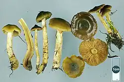 Cortinarius alienatus can have hemispherical caps,[3] or caps which are convex that become broadly umbonate, often with a slimy[3] or glutinous texture.[6] Cap diameter of Cortinarius alienatus is 20–70 mm (0.8–2.8 in).[6] Cap colour tends to be olivaceous[3] but can vary between olive-yellow and olive-grey.[6] The cap commonly has a darker olive-brown, olive-green, or even blackish disk at the centre.[6] The outer edge of the cap is a paler olive-tan colour.[6][3] The cap is not hygrophanous and the colours do not fade significantly when dried.[3][6] The gills of Cortinarius alienatus tend to be thick[3] and yellow-green to citrinous in colour,[6] the same colour as the internal flesh.[6] The flesh bruises brown[3] and has a faintly raphanoid odour.[3][6] The stipe is also yellow to citrinous or grey-citrinous in colour,[6] covered in a texture resembling small thread-like fibres.[3] The veil of Cortinarius alienatus appears sparsely and is slimy or glutinous in texture[6] and yellow-green to olive-brown in colour.[3][6]