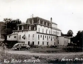 The first mill in Homer was constructed about 1837 by Leon Barney and was likely located near the location of the later Cortright- H. Van Patten Co. Mill. In the 1850s, Cornelius Cuykendall Cortright moved from New York state to Michigan, settling first in Hillsdale County, then Branch County before moving to a location near Homer.[3] In 1886, the original mill burned down.[2] Cortright and his son David formed the firm of C. C. Cortright and Son, and in 1887 had the main section of this flour mill constructed. The Cortrights hired George A. McCartney of Homer as the contractor. A substantial addition was made to the original mill in about 1910. Cortright's son, David W. Cortright, also owned a farm in the area and operated the mill in Homer.