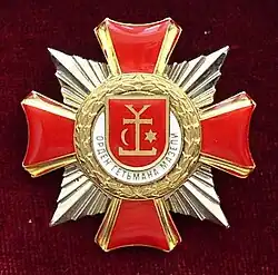 The Hetman Mazepa Award was first made on March 20, 2003 in recognition of civilian involvement in the economic and political independence of Ukraine and the preservation of Ukrainian history, patriotism and cultural traditions.[6] The medallion is made from a silver composite and has the basic shape of a Maltese cross. It is set on a square nickel-plated platform with concave sides; the corners of these are shaped like rays, spreading in different directions. The sides of the cross are red enamel. Surrounding the center of the cross, a gilded circle is set with a decorative pattern. A white enamel insert inside the circle bears the inscription "Order of Hetman Mazepa". On top of this insert, a rounded shield is attached with the coat-of-arms of Hetman Mazepa—gold on a red enamel background.