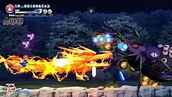 Besides the main stages, there are six secret stages that can be accessed depending on the player's overall performance.[2] After a stage is completed, a pseudo-3D rail bonus stage reminiscent of Panorama Cotton and Rainbow Cotton is played, where players must collect tea cups for extra points.[3][4] Depending on the chosen character, players lose a live after getting hit by enemies or the timer runs out. The game employs a respawn system where a downed player will start off immediately at the location they died at, with a penalty of decreasing the character's firepower. Once all lives are lost, the game is over but players can keep playing by inserting more credits into the arcade machine to continue playing (arcade version) or using a limited number of continues (home versions).
